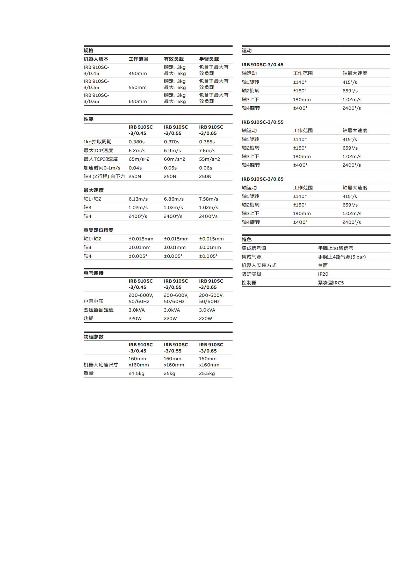 現(xiàn)有三種配置 : IRB 910SC –3/0.45、IRB 910SC – 3/0.55、 IRB 910SC – 3/0.65;