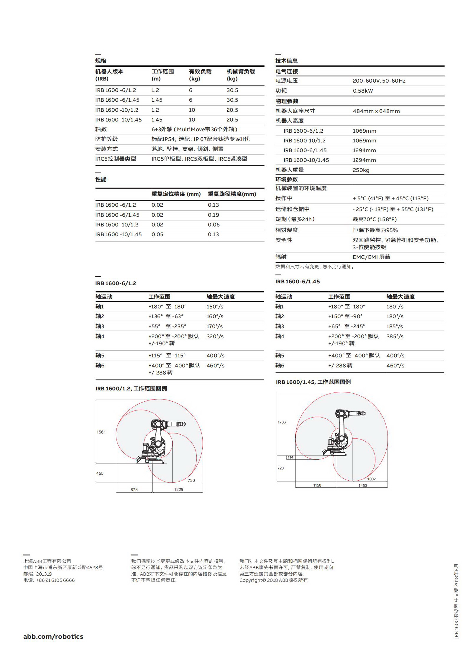 與物料搬運、上下料和加工應用領域的其他同類機器人相比,IRB1600的作業(yè)周期縮短了一半。得益于ABB專利的第二代QuickMove運動控制以及機器人的強大電機和直齒輪的低摩擦損耗,ABB機器人IRB1600加速和降速均快于其他機器人,節(jié)約了不同任務之間的切換時間。
