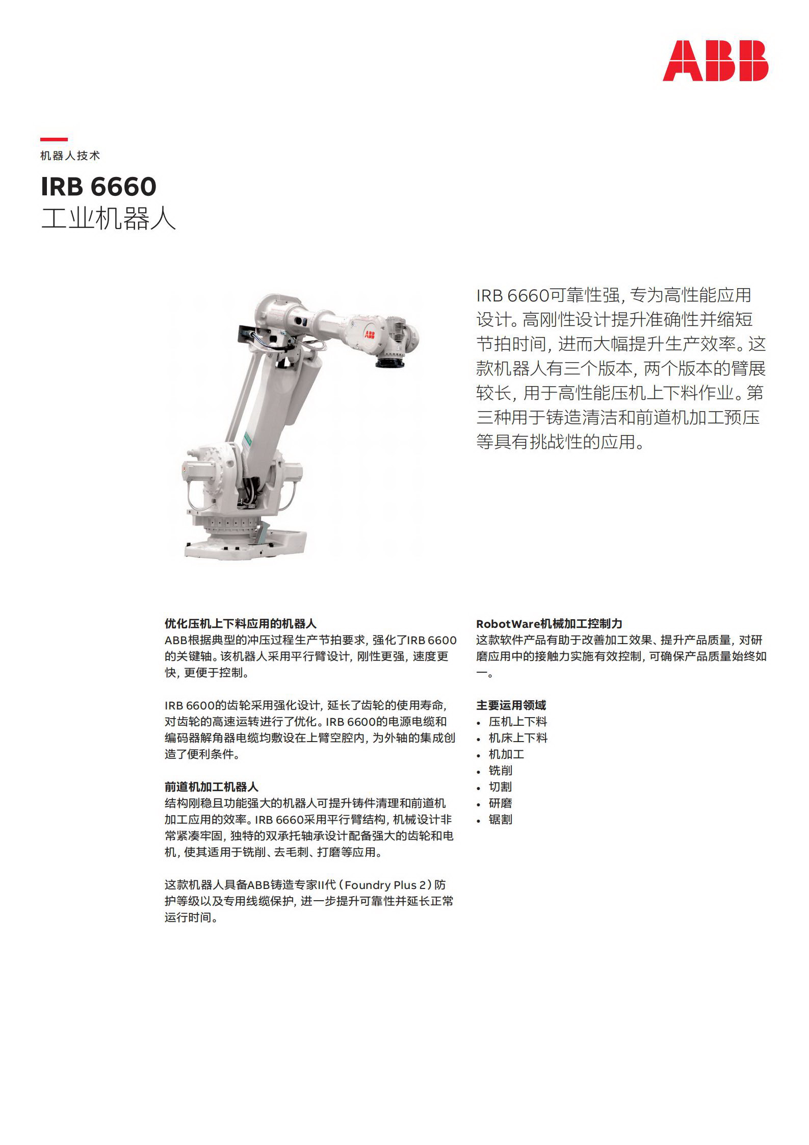 ABB機器人根據(jù)典型的沖壓過程生產(chǎn)節(jié)拍要求,強化了IRB6600 的關(guān)鍵軸。該機器人采用平行臂設(shè)計,剛性更強,速度更快,更便于控制。IRB6600的齒輪采用強化設(shè)計,延長了齒輪的使用壽命,對齒輪的高速運轉(zhuǎn)進行了優(yōu)化。IRB6600的電源電纜和編碼器解角器電纜均敷設(shè)在上臂空腔內(nèi),為外軸的集成創(chuàng)造了便利條件。前道機加工機器人結(jié)構(gòu)剛穩(wěn)且功能強大的機器人可提升鑄件清理和前道機加工應(yīng)用的效率。IRB 6660采用平行臂結(jié)構(gòu),機械設(shè)計非常緊湊牢固,獨特的雙承托軸承設(shè)計配備強大的齒輪和電機,使其適用于銑削、去毛刺、打磨等應(yīng)用。這款機器人具備ABB鑄造專家II代(Foundry Plus2)防護等級以及專用線纜保護,進一步提升可靠性并延長正常運行時間。