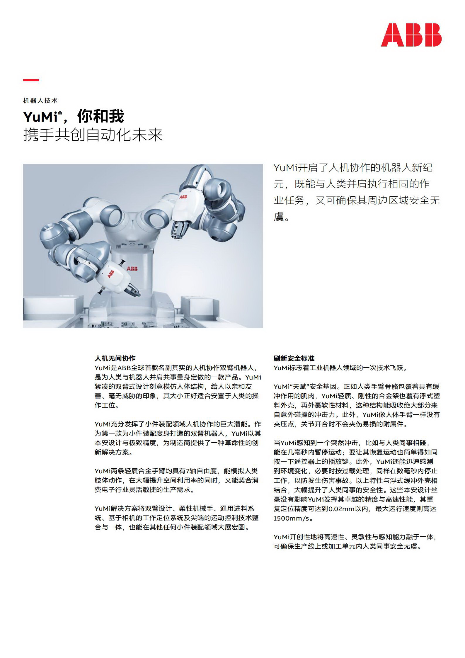 YuMi是ABB機器人全球首款名副其實的人機協(xié)作雙臂機器人,是為人類與機器人并肩共事量身定做的一款產(chǎn)品。YuMi 緊湊的雙臂式設(shè)計刻意模仿人體結(jié)構(gòu),給人以親和友善、毫無威脅的印象,其大小正好適合安置于人類的操作工位。YuMi充分發(fā)揮了小件裝配領(lǐng)域人機協(xié)作的巨大潛能。作為第一款為小件裝配度身打造的雙臂機器人,YuMi以其本安設(shè)計與極致精度,為制造商提供了一種革命性的創(chuàng)新解決方案。YuMi兩條輕質(zhì)合金手臂均具有7軸自由度,能模擬人類肢體動作,在大幅提升空間利用率的同時,又能契合消費電子行業(yè)靈活敏捷的生產(chǎn)需求。